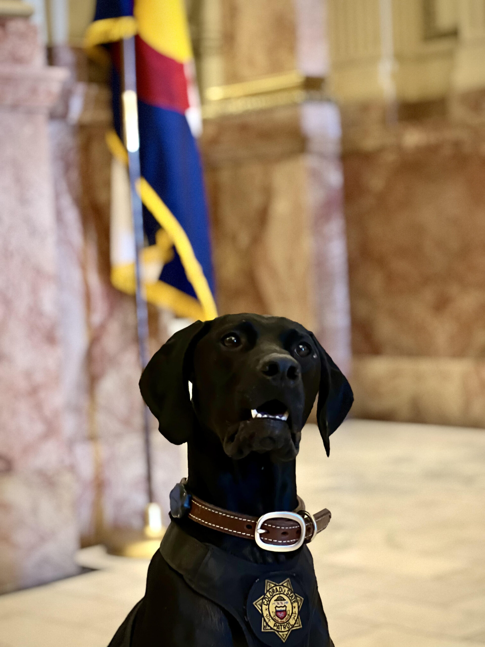 K9 Scout is a four year old German Shorthaired Pointer. He is trained in explosive detection and looks for bombs, guns and shell casings and is currently training to become certified in tracking. For the last three years he has worked for the Colorado State Patrol Executive Security Branch along side his handler, Trooper Crystal Crenshaw.